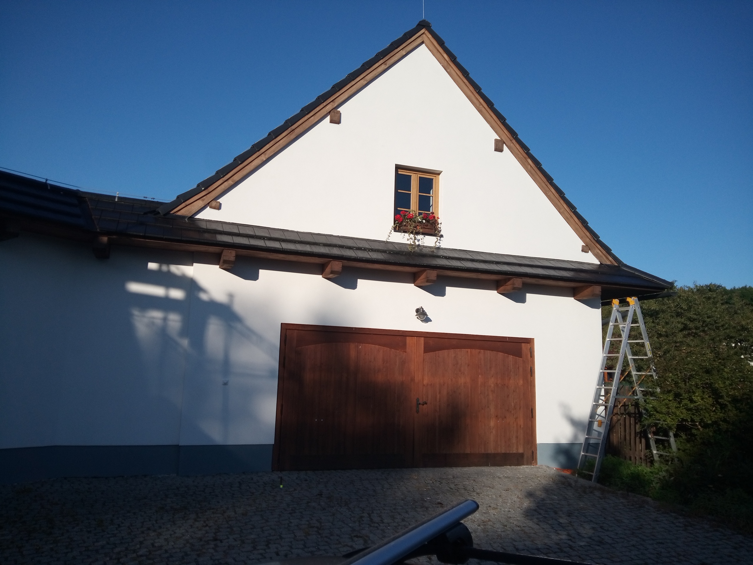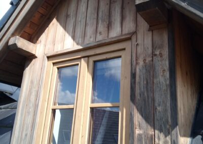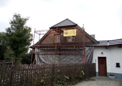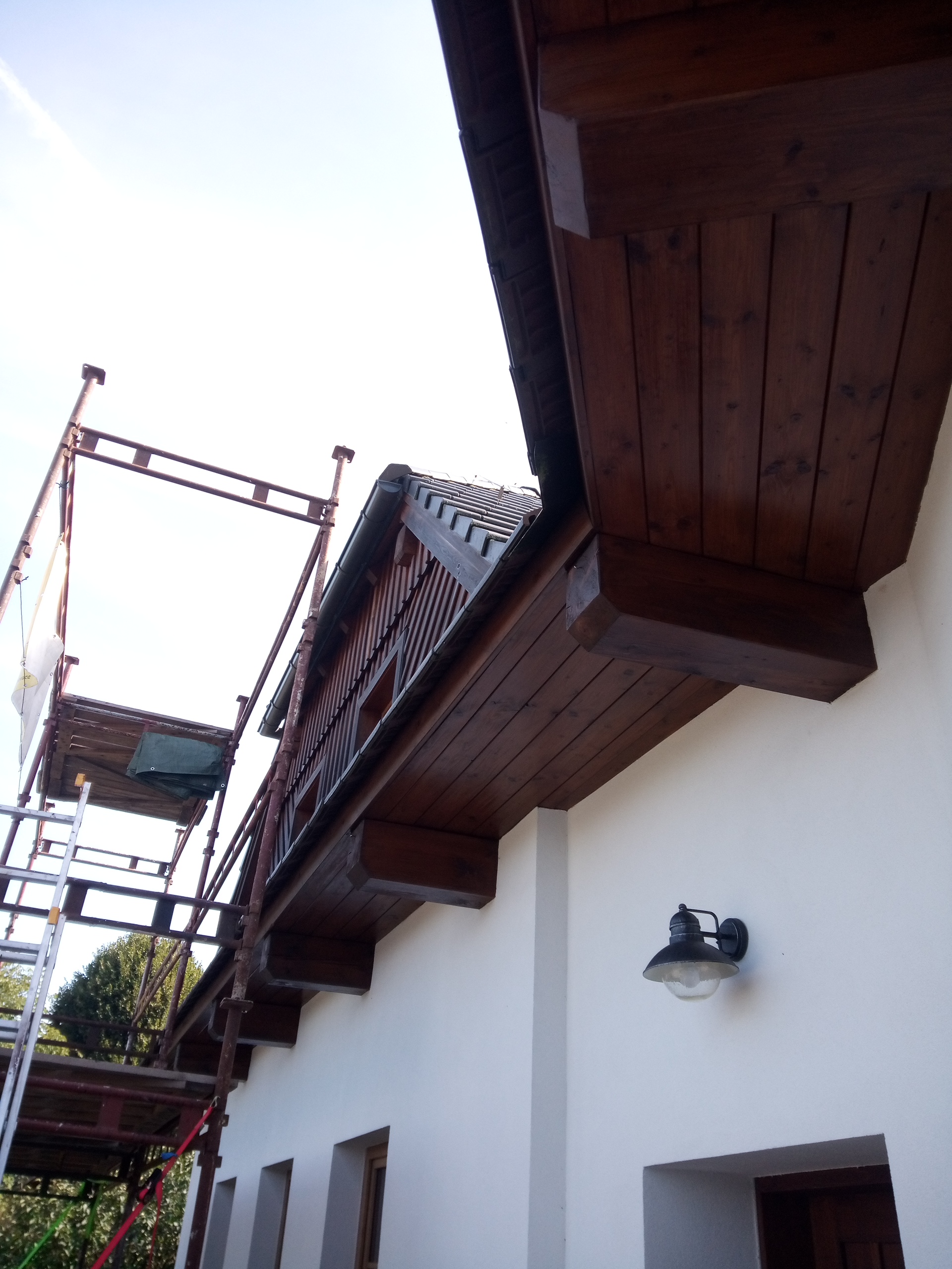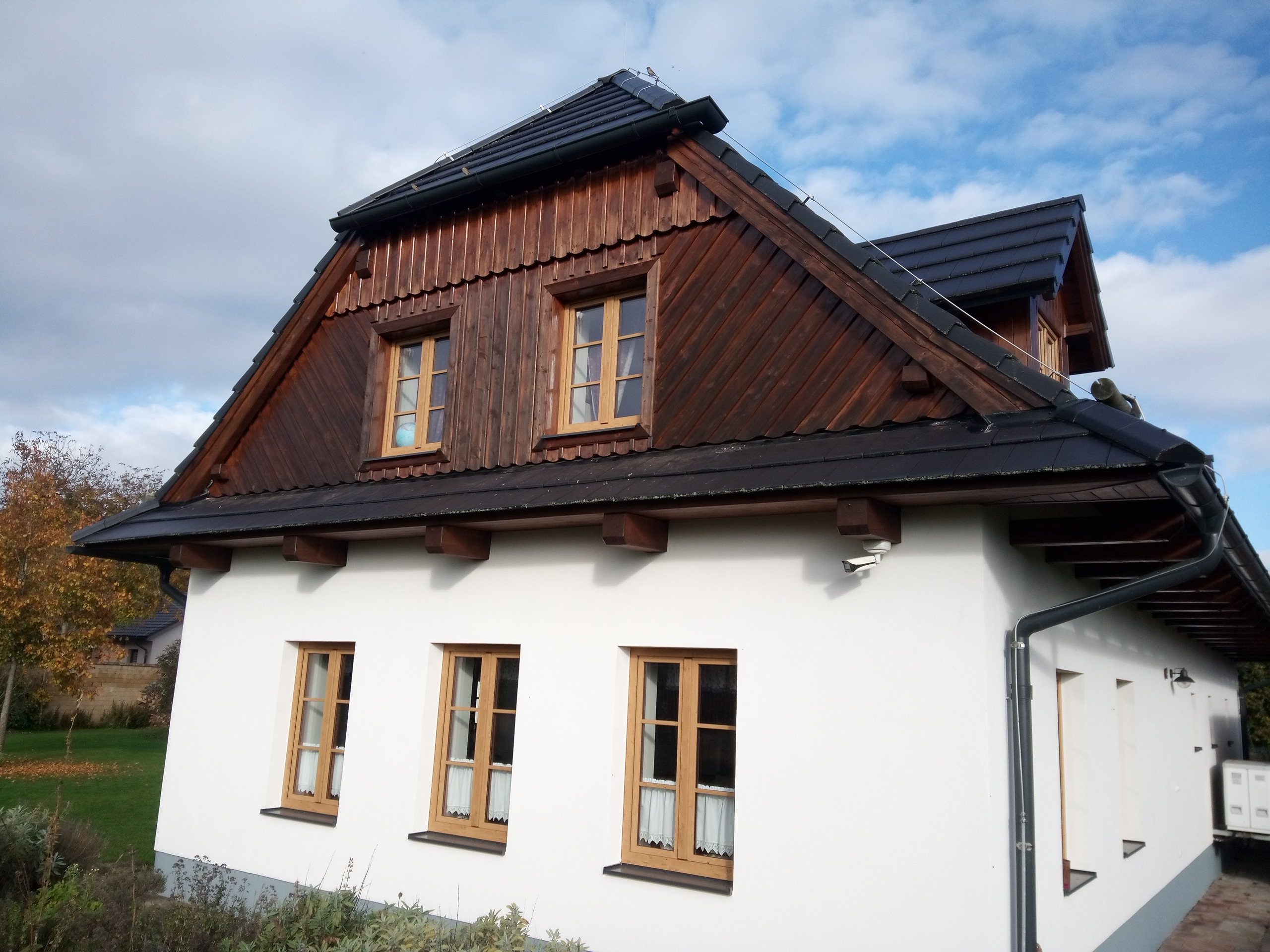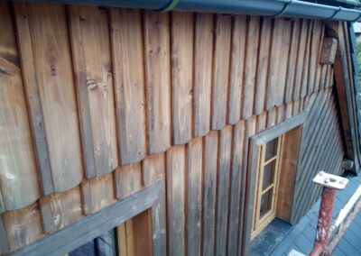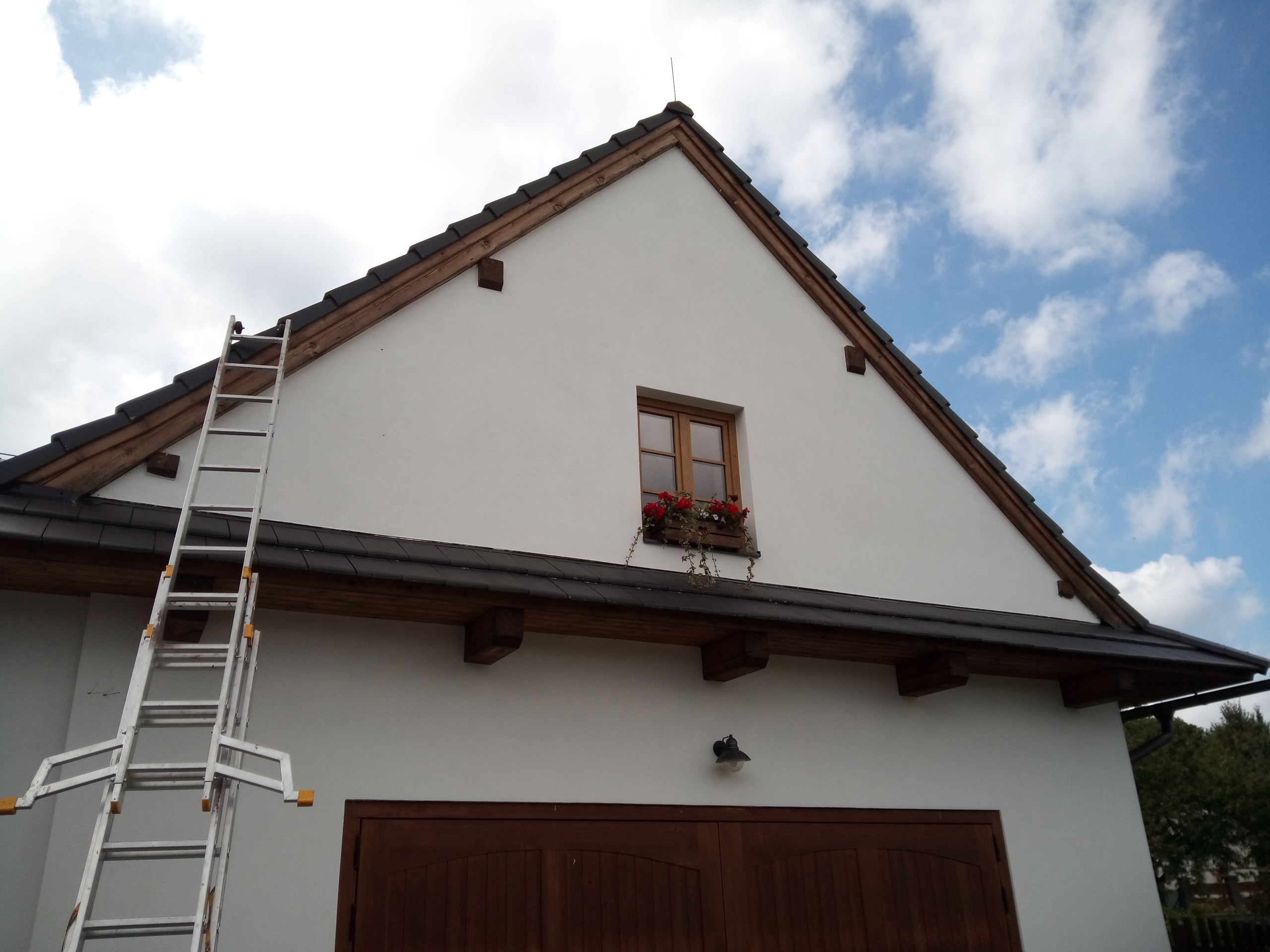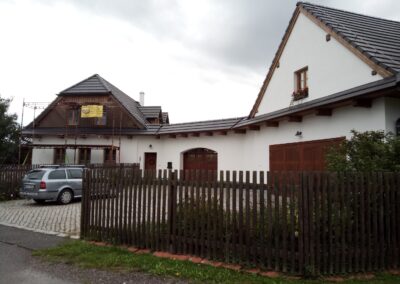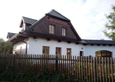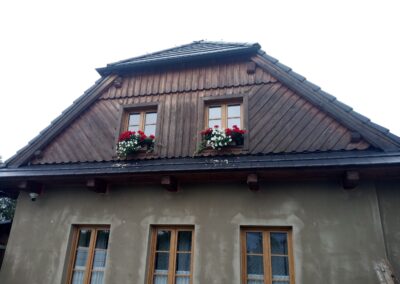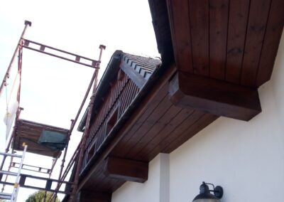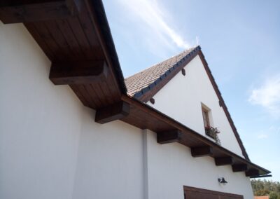 Provedení prací na krásném RD – očištění dřevěných štítů, arkýřů, venkovních krokví, podhledů ad. a jejich nátěry. Ošetření dřevěných částí a hezká proměna zašlých nátěrů u tohoto RD.