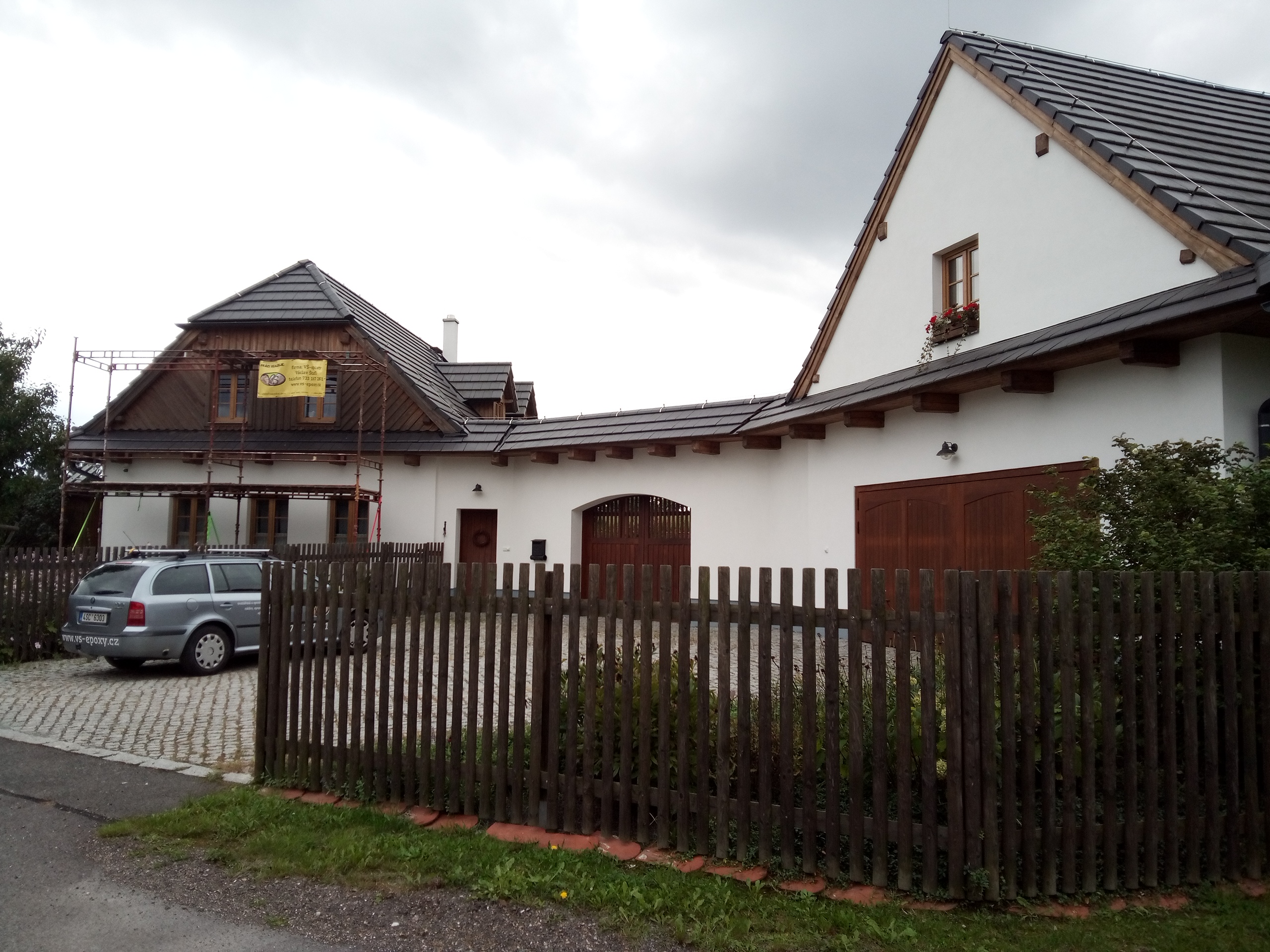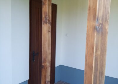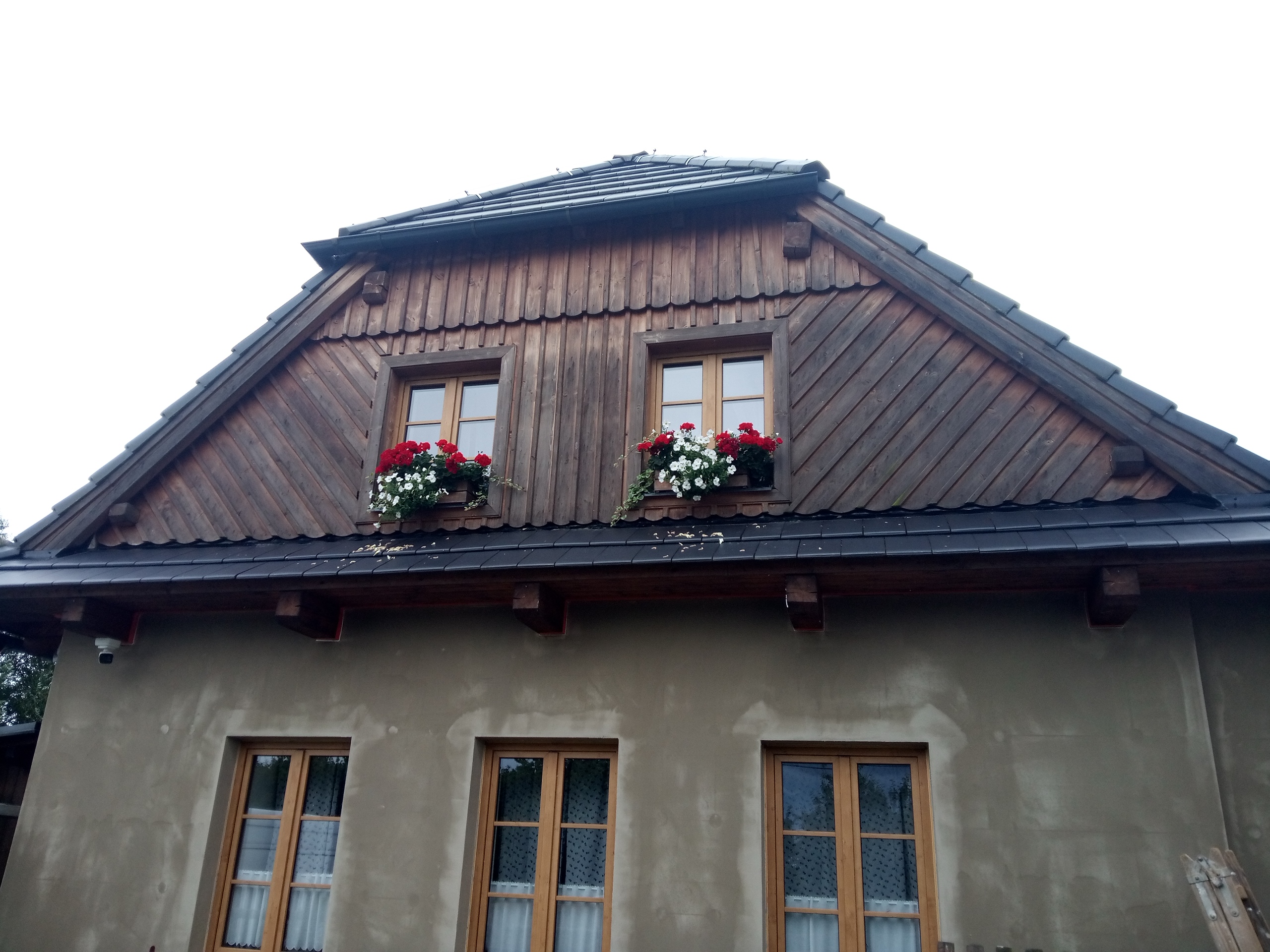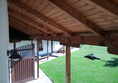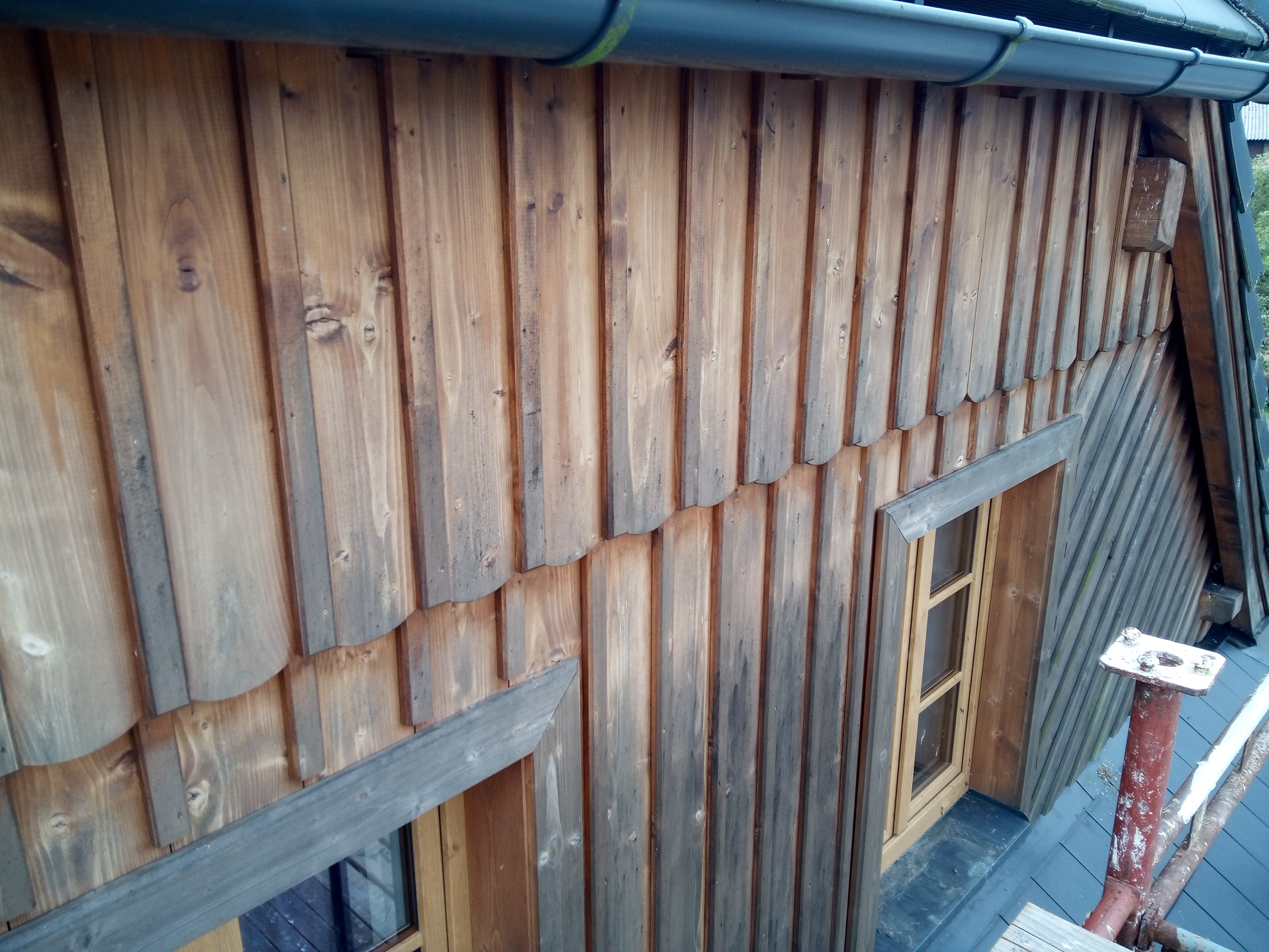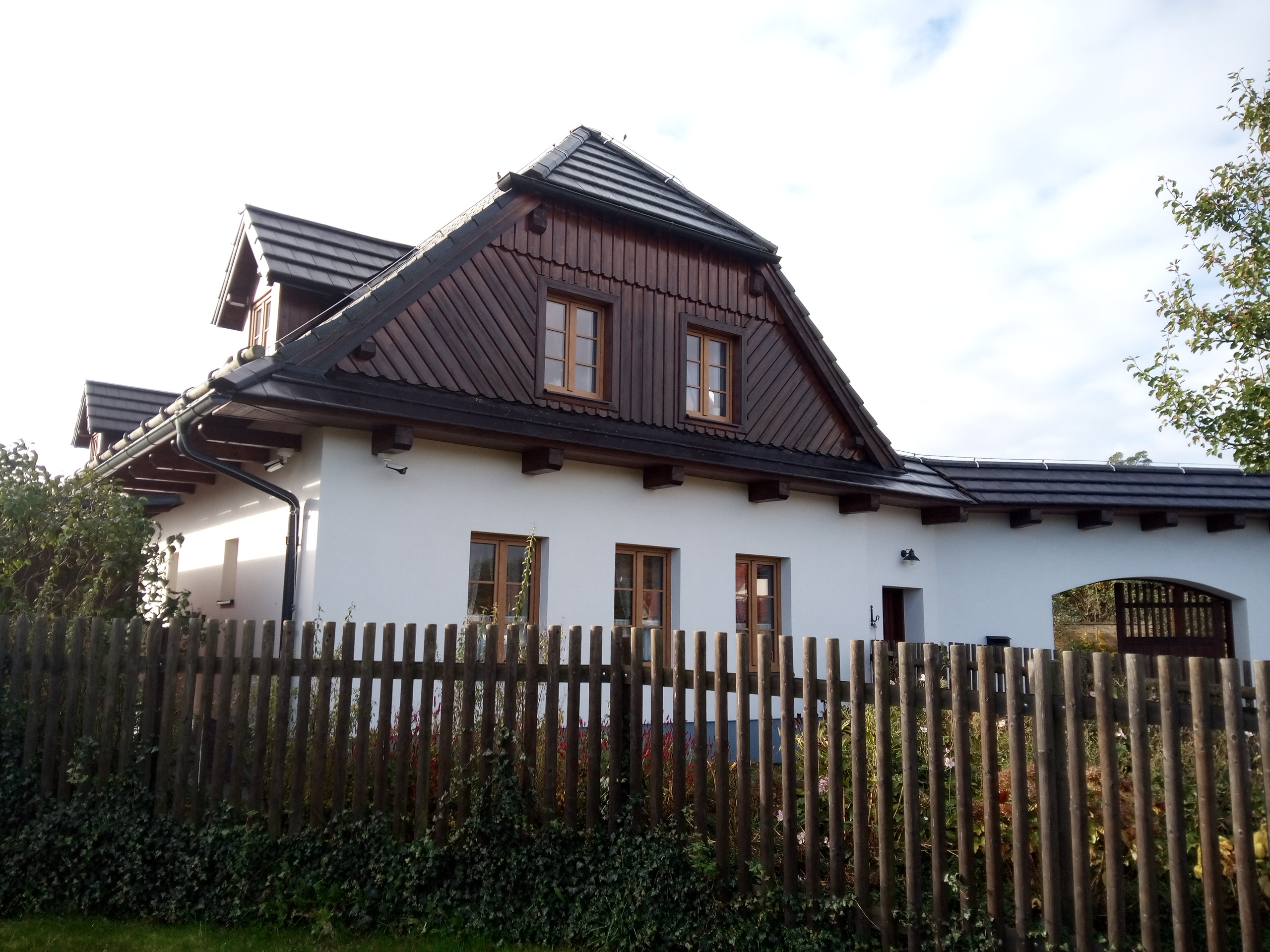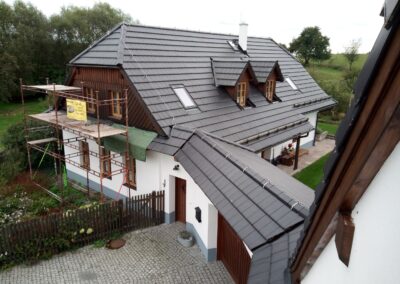Provedení prací na krásném RD – očištění dřevěných štítů, arkýřů, venkovních krokví, podhledů ad. a jejich nátěry. Ošetření dřevěných částí a hezká proměna zašlých nátěrů u tohoto RD.