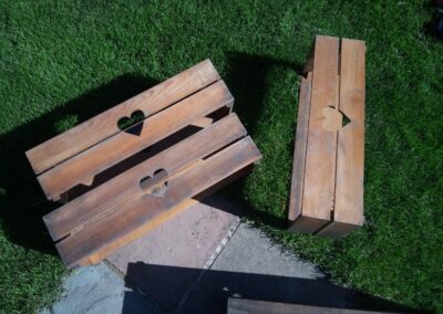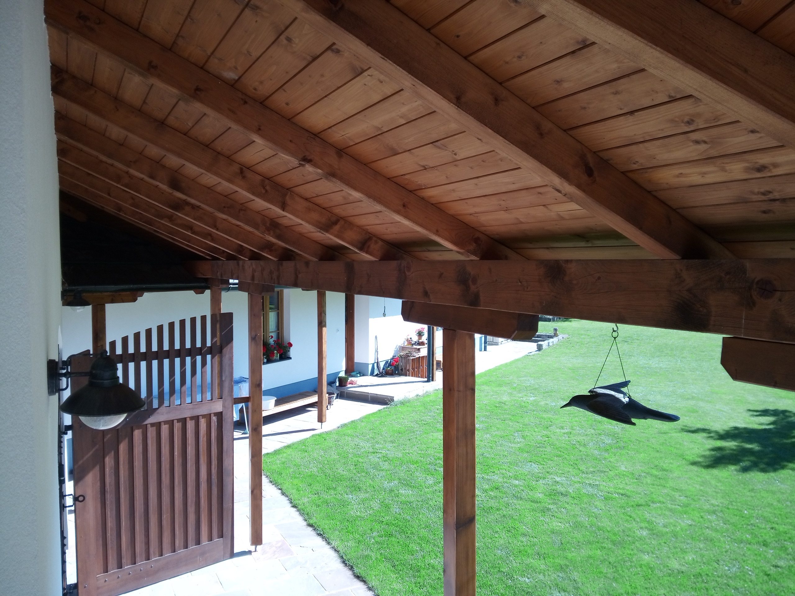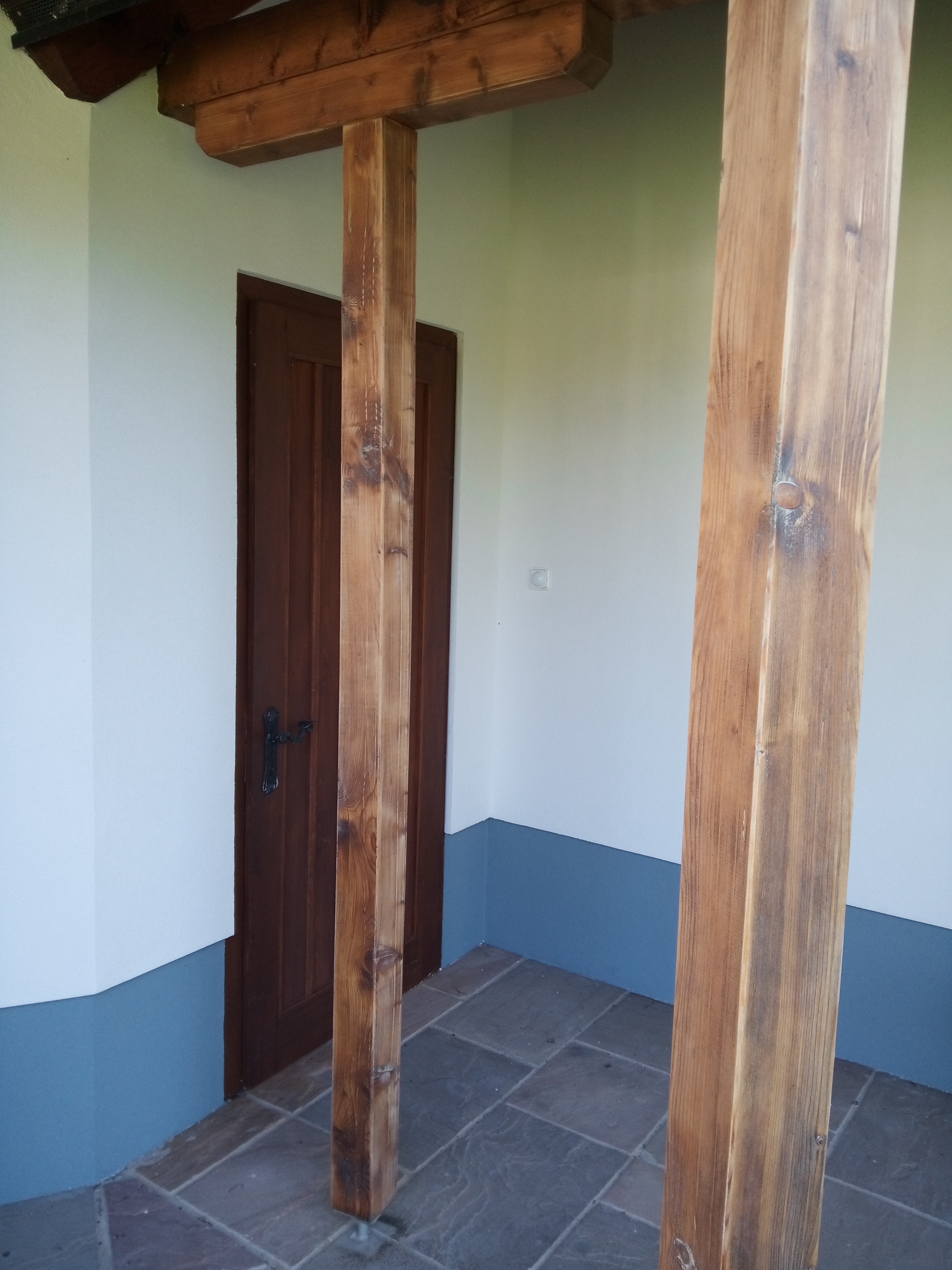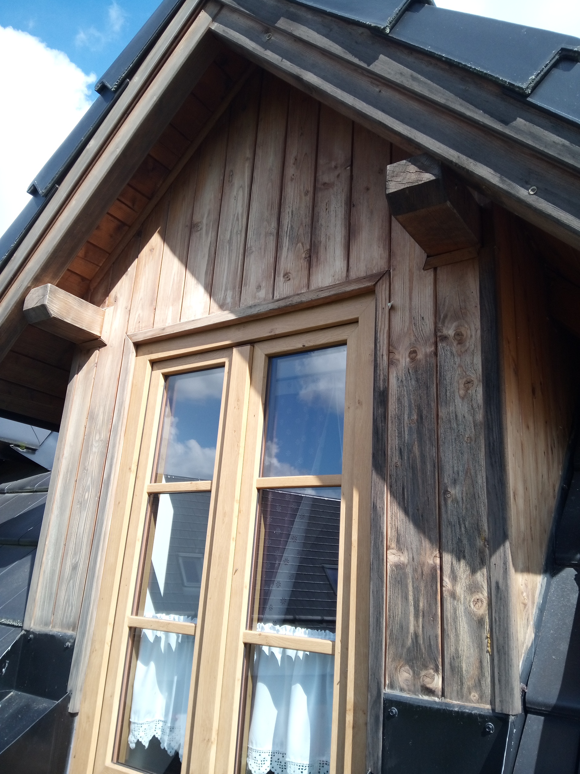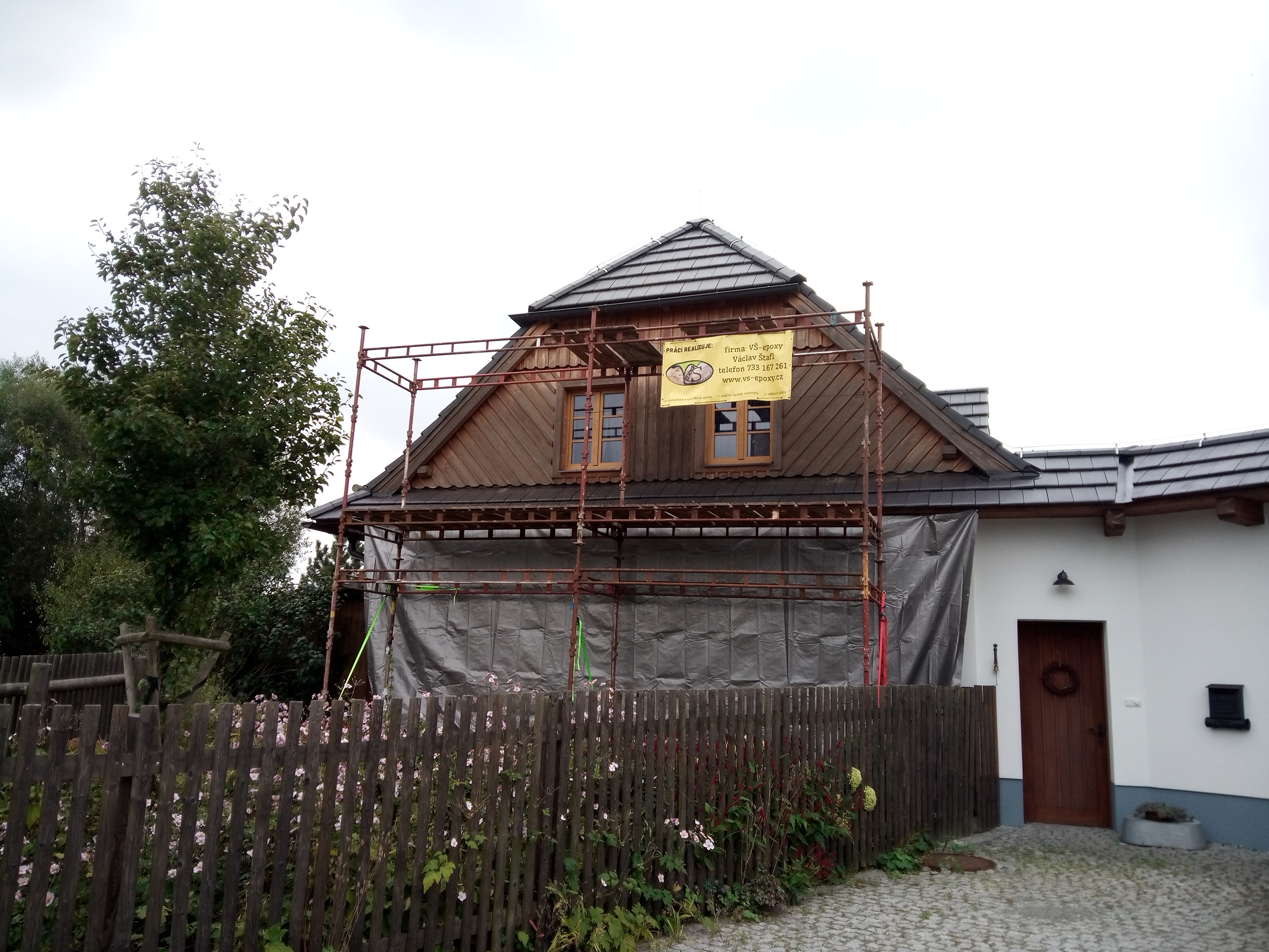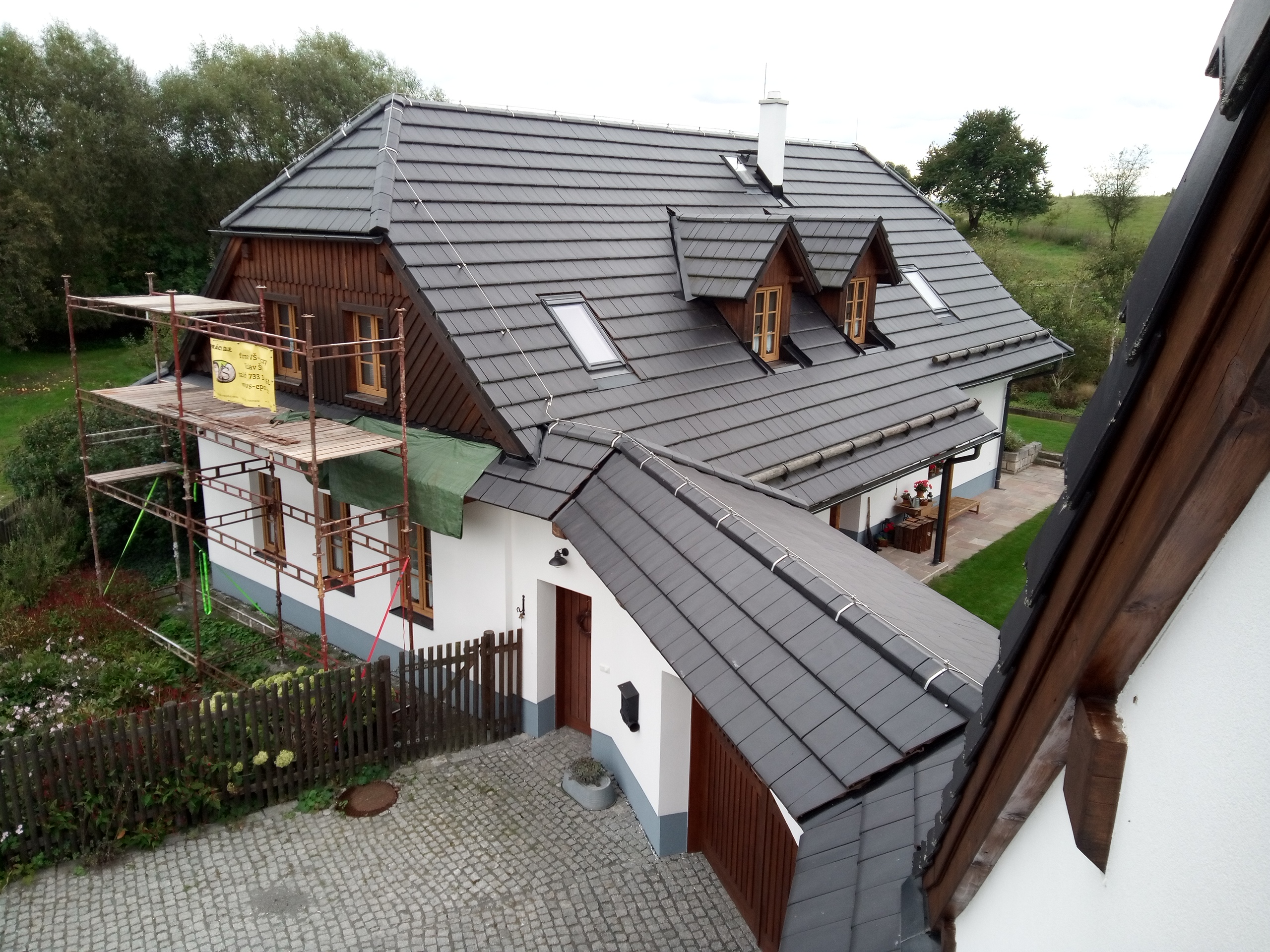 Provedení prací na krásném RD – očištění dřevěných štítů, arkýřů, venkovních krokví, podhledů ad. a jejich nátěry. Ošetření dřevěných částí a hezká proměna zašlých nátěrů u tohoto RD.