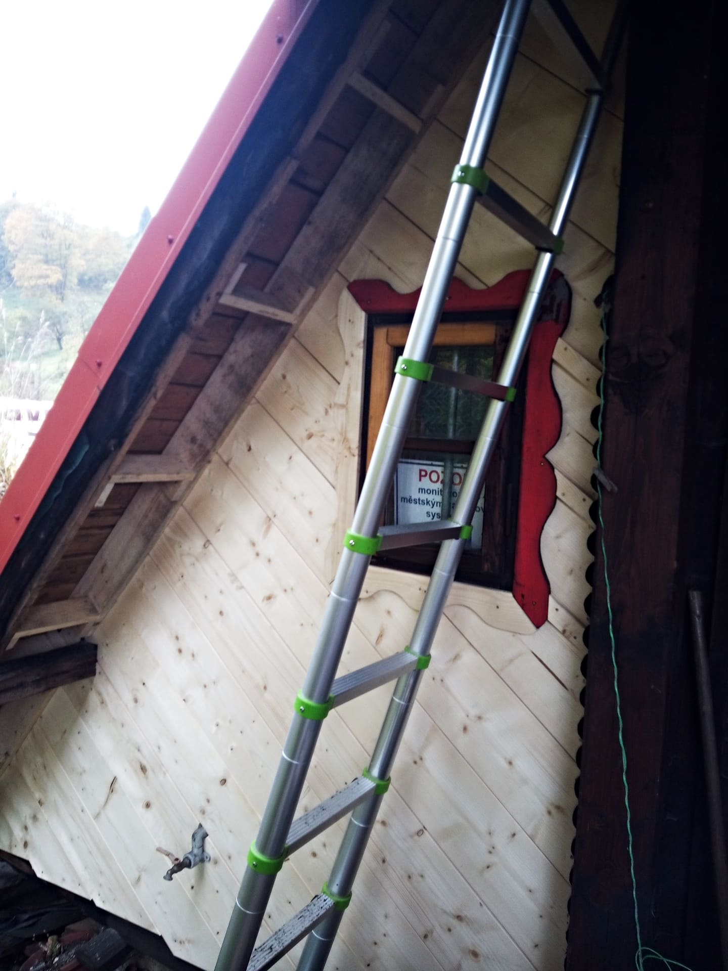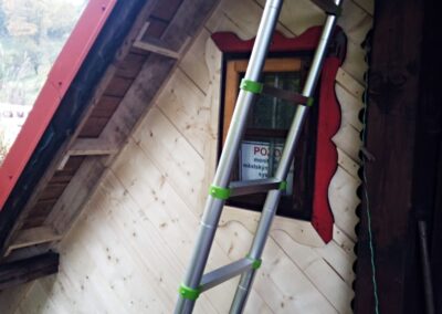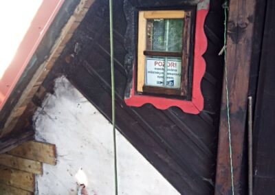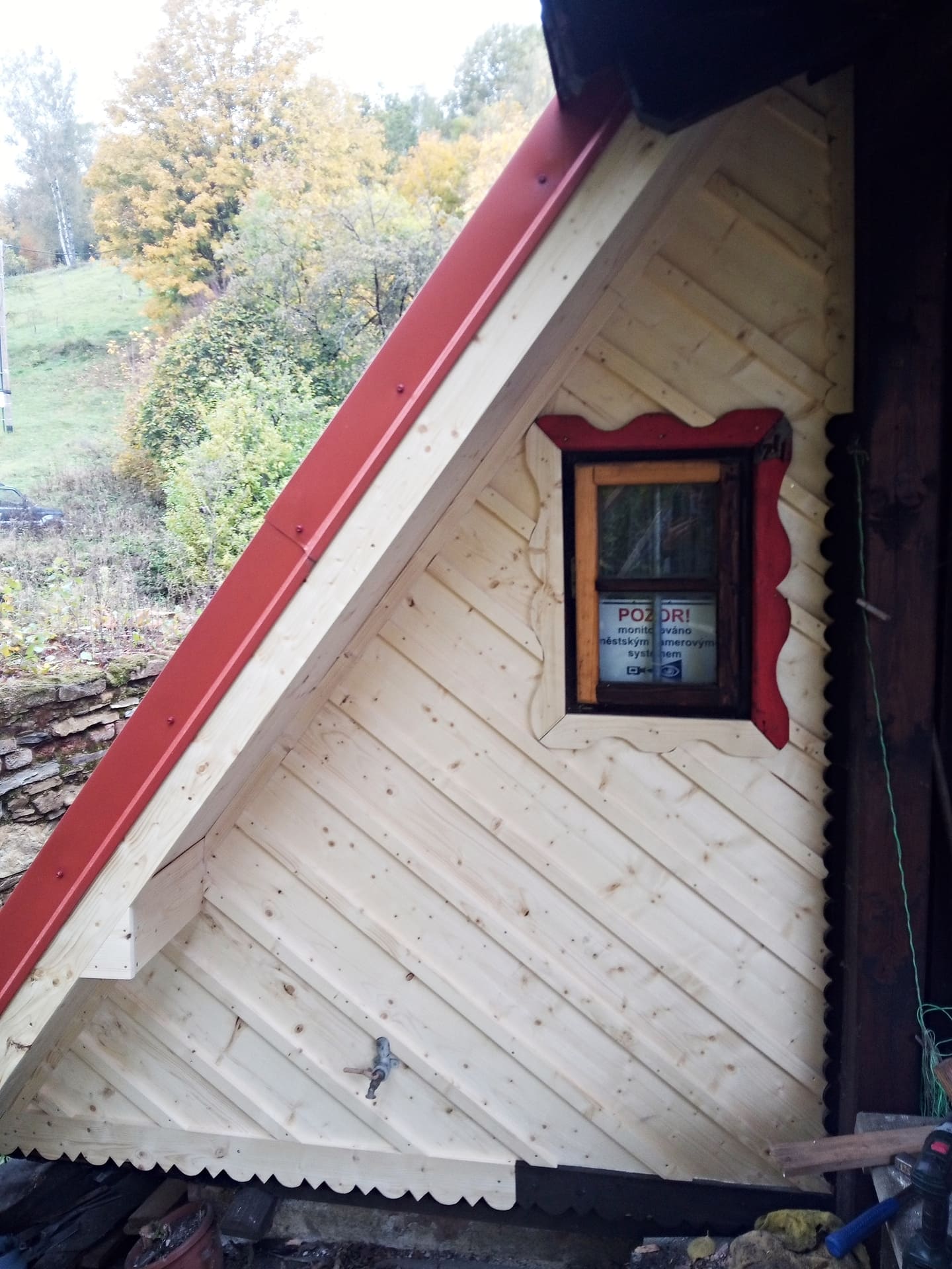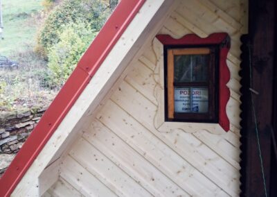 Rekonstrukce ohořelé části dřevěného štítu na chalupě v KRNAPu, včetně výroby a usazení ozdobných lišt.